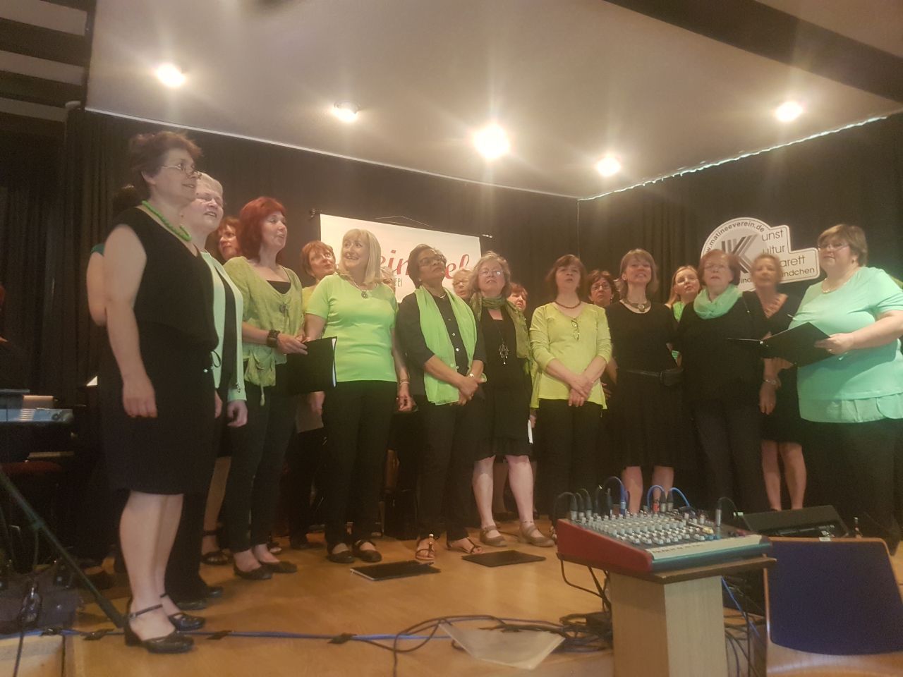 An diesem Nachmittag trafen sich unsere Chormitglieder schon um 17.30 Uhr im Haus des Gastes. Zunächst versammelten sich alle zum Einsingen. Dann ging es zu einer kleinen „Generalprobe„ auf die Bühne, die bekanntlich nicht sehr groß ist. Aber mit gutem Willen und viel Gelächter fand jede ihr Plätzchen.